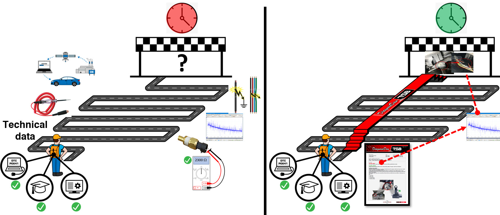 TSBs, whether they are OE Manufacturer TSBs or Aftermarket TSBs, are often based on actual repair case studies conducted by professional workshops. These case studies typically include detailed information on the diagnosis of the problem, including the root cause and any related issues that may have contributed to the problem. They may also include information on which parts failed, as well as pictures or diagrams showing the affected areas.