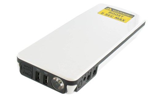 Funktionen sind u. a. 12-V-Notstart, LED-Lampe, 2 USB-Anschlüsse für die Verwendung von Geräten und deren Aufladung sowie ein 19-V-Laptop-Ausgang