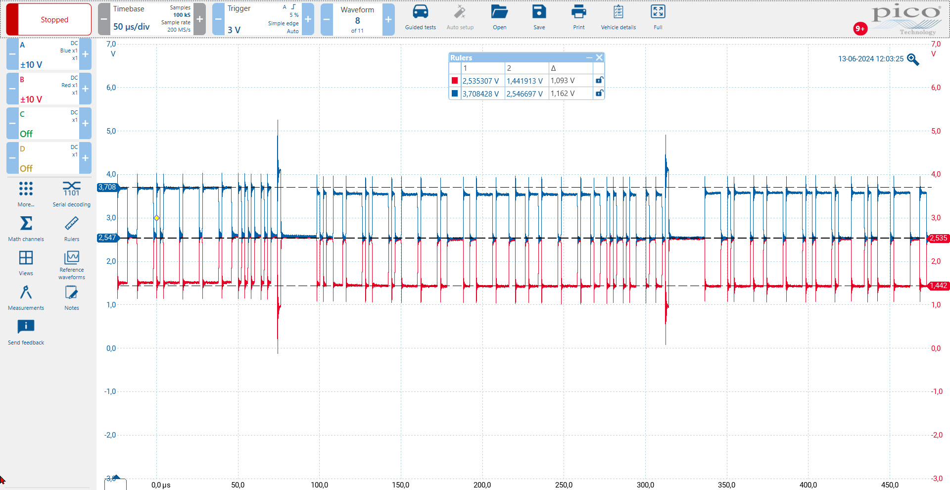 Diagnosing this problem varies across workshops, and symptoms can also differ. Some workshops focus on the fault code U014000 – Lost Communication With Body Control Module and start by measuring the Canbus between the engine control unit and the BCM (J519). Often, they find that the Canbus looks flawless even when the fault is present. See the attached measurement with PICO.