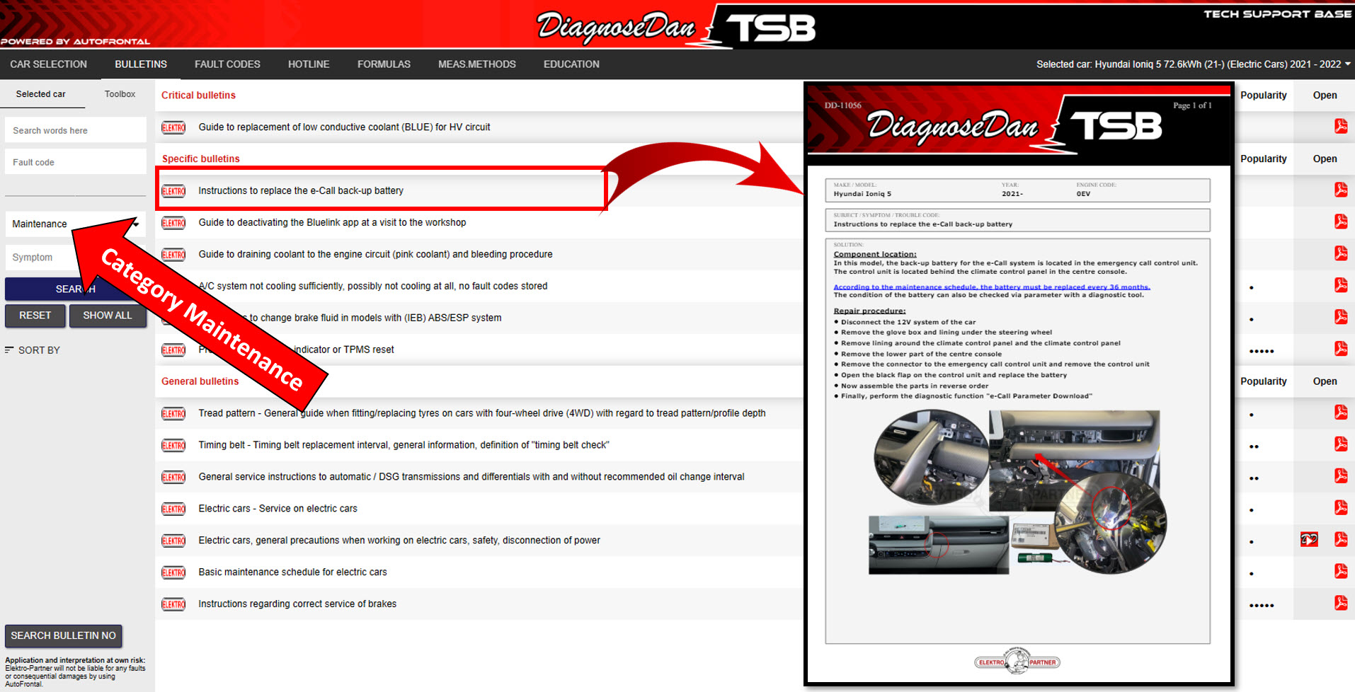 There are several ways to find information about this in DDTSB. If you need information related to maintenance (like the replacement of the SOS battery), select the car in DDTSB, go to bulletins, and select the category “Maintenance.” The program will list TSBs matching the selected car that are related to maintenance. See an example on a Hyundai Ioniq 5: