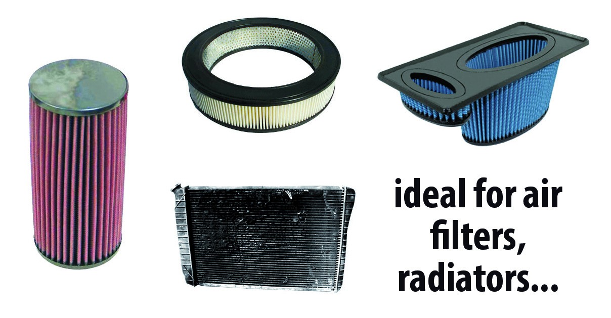 Enlève de manière plus rapide et plus efficace de la poussière/de la pollution des filtres à air, des radiateurs de refroidissement (transport frigorifique), des condenseur (climatisation), etc.