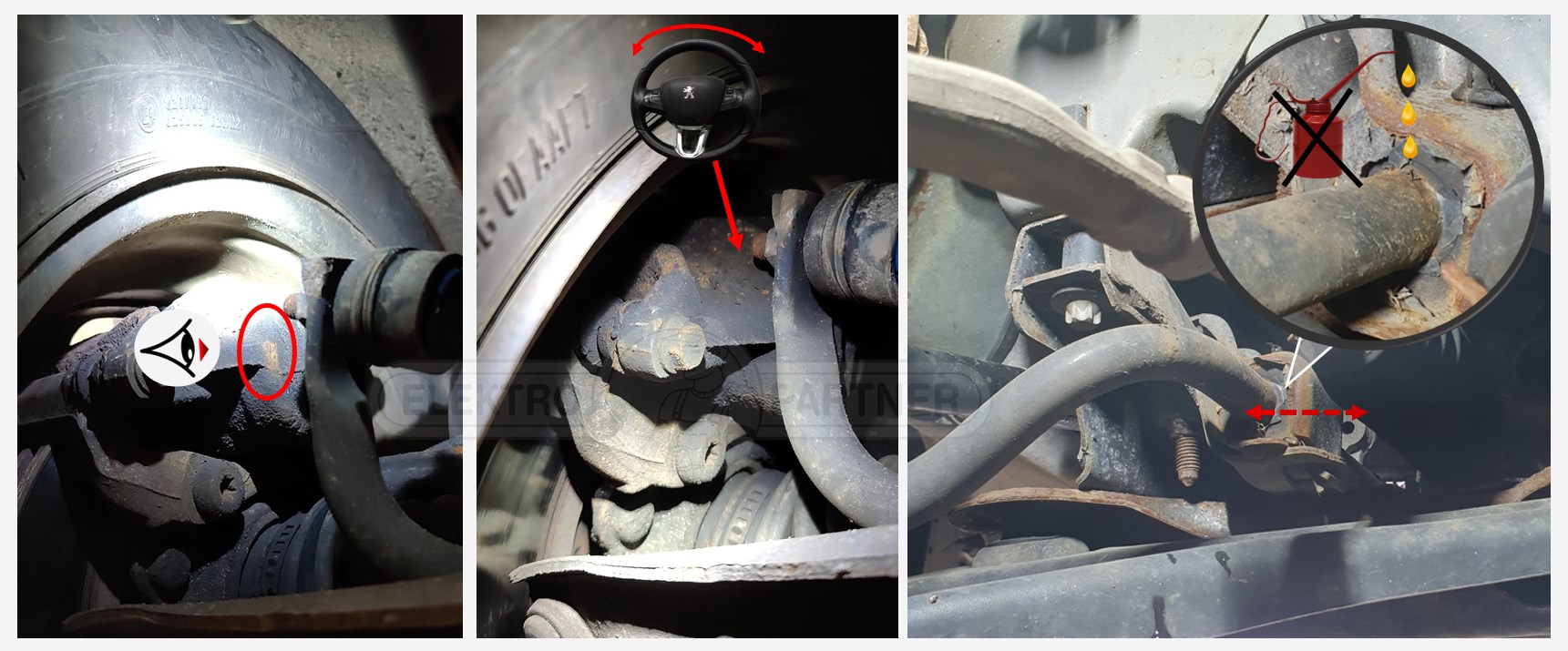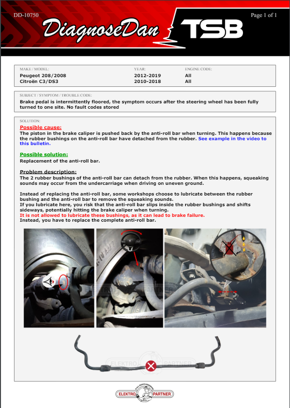 As stated in DDTSB TSB No. 10750, the workshop can be at fault for this serious error if it has lubricated the rubber bushing of the anti-roll bar with a lubricant, for example, due to squeaking noises from the anti-roll bar. If this is done, the anti-roll bar can shift sideways, and when turning the steering wheel, the bar can push the brake caliper together, so the customer has to pump the brake pedal several times before the car brakes. For the same reason, the rubber bushings are not sold as a separate spare part by the car manufacturer. When squeaking noises from the anti-roll bar occur, it is because the bushings are worn, and a complete anti-roll bar must be replaced.