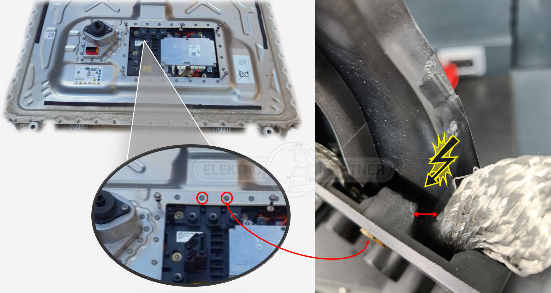 The car was eventually passed to an independent inspection body that could go deeper than a normal workshop. They disassembled the HV battery and finally measured and proved the fault. The cause was clear. Uninsulated HV flex bus bars had rubbed against the base plate and over time this wear had created shorts to ground through the bolts securing the battery cover.