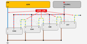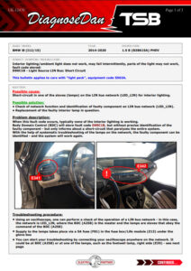 This model, equipped with option code S563A “light pack”, uses a LIN bus network (LED_LIN) for interior lighting. The Body Domain Controller (BDC) acts as master, while the individual lamps work as slaves on the network. When one of the lamps develops a short circuit, the entire system can go down.