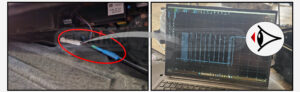 The oscilloscope confirmed that communication was being pulled down by one of the slave units. By unplugging the lamps one by one, the workshop isolated the defective component that caused the short-circuit.