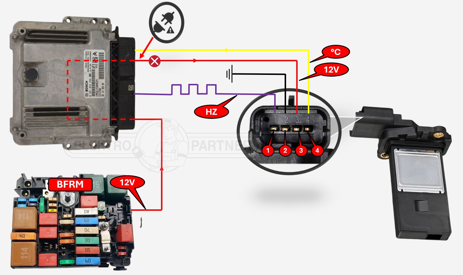 A common challenge with this error is that the tester’s parameter readings display a default value, misleading technicians into thinking the air mass sensor is functioning correctly. However, if you read the value via the OBD protocol, you’ll find the real reading is actually zero when the fault is present.