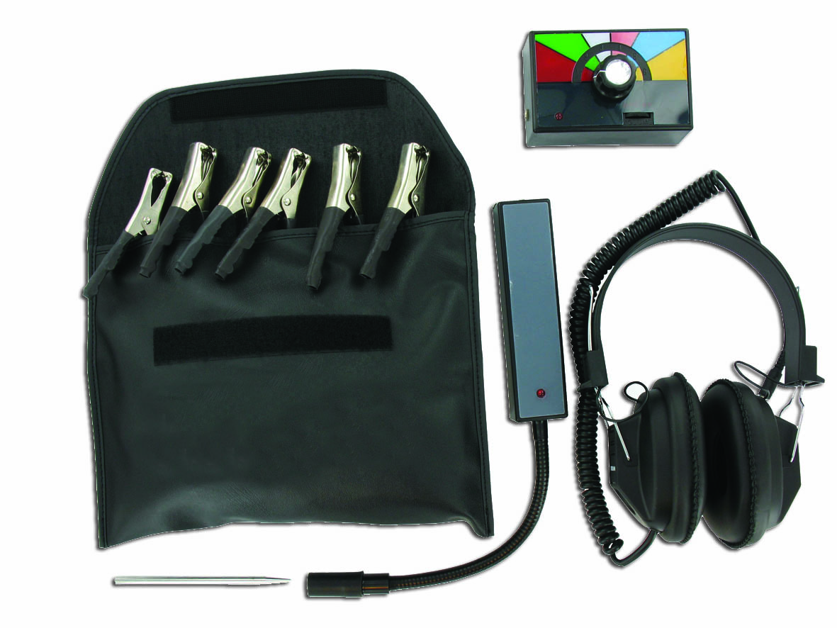 Kit bevat een ontvanger, 6 microfoonklemmen, een geluidsversterker met metalen sonde, hoofdtelefoon