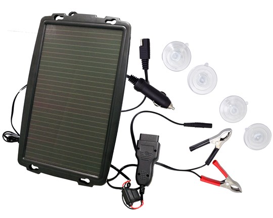 Includes: 12 Volt DC plug, alligator battery clamps, suction cups to easily mount the solar panel to the vehicle's windshield and OBD2 connector