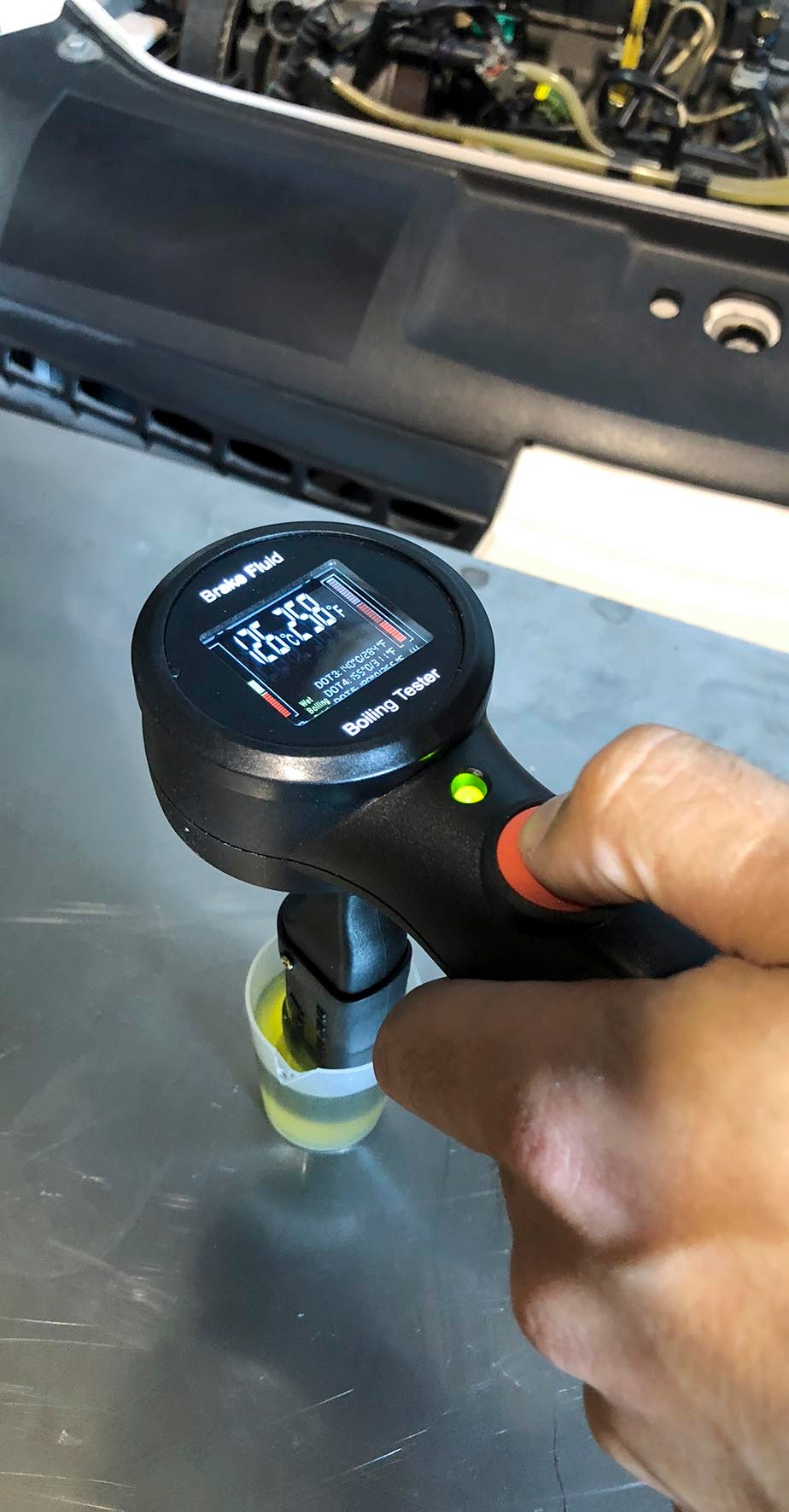 Precision testing of the boiling temperature of the brake fluid (wet boiling point) in °C and °F