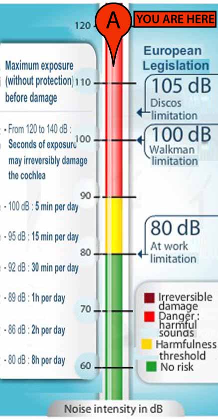 The risk of the noise : Remember a deflating tire reach easily 115db! And above 115 dB , very brief sounds immediately cause irreversible damage.