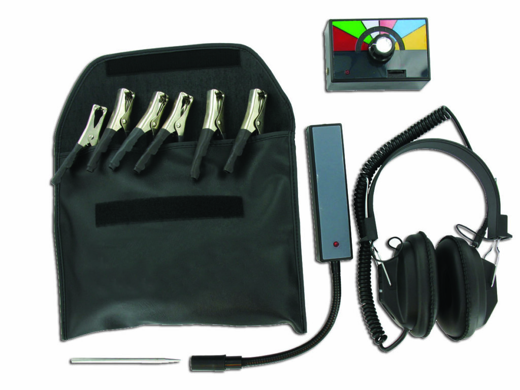 Kit contents a receiver, 6 microphone clamps, a noise amplifier with metal probe, headphone