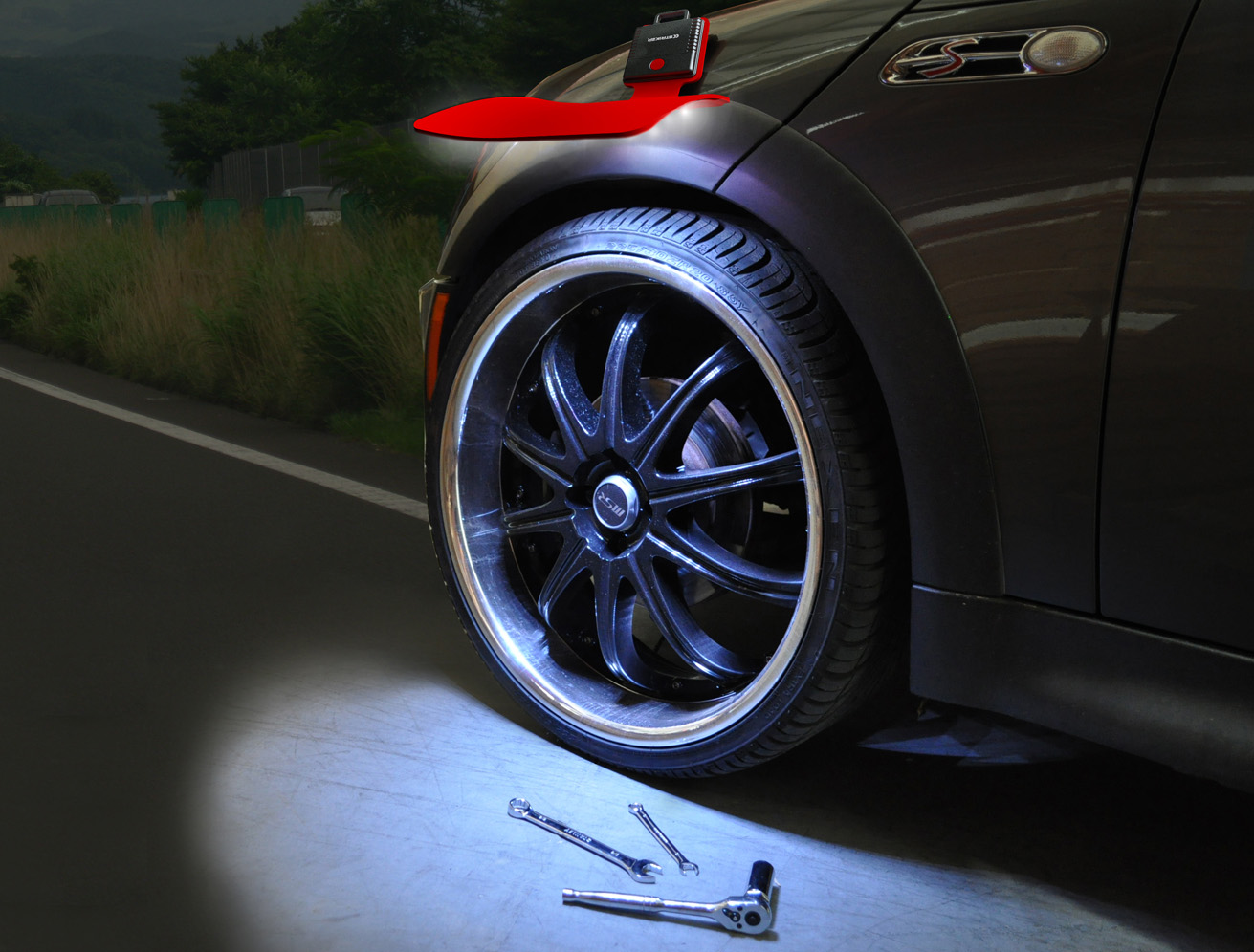 The durable ABS base holds 3 AA batteries (included), the electronic switch and circuit, two large neodymium (rare earth) magnets, and a loop to hang or mount the light